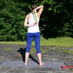 So wird’s gemacht: Nimm das Fitnessband mit beiden Händen und führe es hinter den Körper, als würdest Du die Hände hinter dem Körper zusammenführen. Nun ziehe die Hand des oberen Armes über Deinen Kopf, wobei sich nur der Unterarm bewegt. Achtung: Der untere Arm verbleibt in seiner Position.