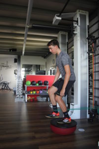 Einbeinstand auf dem Jumper, das Knie leicht gebeugt. Um das andere Bein, kurz über dem Fußgelenk das vorgespannte Theragymband®. Das Bein mit dem Theragymband® vor und zurück führen