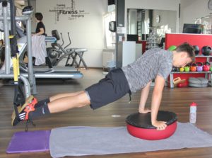 Wird die „Instabilität“ aber richtig eingesetzt profitiert die Stabilität des Körpers enorm. Durch den Einsatz der Instabilität – hier des TOGU Jumper Pro®– in Verbindung mit anderen Trainingsgeräten wie FlexVit Miniband®, Theragymband® und Slingtrainer wird die Muskulatur dazu gezwungen die Bewegungen des TOGU Jumpers auszugleichen. Je nach Übung und Auswahl der Trainingsgeräte werden durch die Instabilität die tief liegenden kleinen Muskeln der Rückenmuskulatur, besonders die M. multifidi gekräftigt. Die Muskeln um das Knie – und Fußgelenk beansprucht und somit im Endeffekt die beiden Gelenke stabilisiert. Durch die Liegestützübung wird der gesamte Schultergürtel gekräftigt, in Kombination mit dem Bergsteiger werden auch die Bauchmuskeln beansprucht. Wichtig bei den Übungen ist den Jumper möglichst in der Waagrechten halten und wenig zu „kippeln“.
