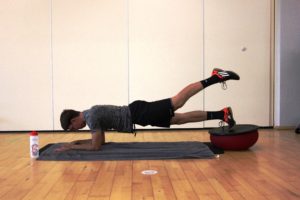 Plank mit den Fußspitzen auf dem Jumper, als Variation ein Bein abheben