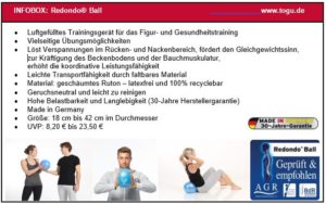 Mit dem TOGU® Redondo® Ball bekommt der sportliche Nutzer für wenig Geld ein simples und doch geniales Trainingsgerät. Der luftgefüllte Gymnastikball mit griffig softweicher Oberfläche ist die ideale Unterstützung beim Figur- und Gesundheitstraining. Bereits in mehreren Größen und wahlweise mit oder ohne Noppen erhältlich, eignet sich der Redondo® Ball sowohl für Übungen im Sitzen, Knien als auch im Stehen. Besonders beliebt ist der sportliche Allrounder auch beim Beckenboden- und Bauchmuskeltraining. Als dynamische Stützfläche bedingt er minimale Ausgleichsbewegungen bei denen tiefliegende, oft wenig beanspruchte Muskelpartien arbeiten. Dadurch werden das Gleichgewicht und die Reflexe geschult, der Körper erlangt Stabilität und wird koordinativ leistungsfähiger. Geprüft und empfohlen vom Forum Gesunder Rücken – besser leben e.V. und dem Bundesverband der deutschen Rückenschulen (BdR) e.V. hilft der Redondo® Ball zudem durch gezielte Übungen den Nacken- und Rückenbereich zu stärken. Das faltbare Trainingsgerät eignet sich durch seine hohe Belastbarkeit und leichte Transportfähigkeit sowohl für die kurze Fitnesseinlage zwischendurch als auch für längere Sportsessions. In den meisten Pilates- und Gymnastikkursen ist der TOGU®-Klassiker bereits zur Standardausrüstung avanciert. Der günstige Preis und die leichte Handhabung machen ihn aber auch zum idealen Sportgerät für das Training zu Hause.