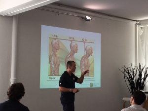 Schwerpunkt Thema in diesem Jahr war die Halswirbelsäule (HWS). Mit Christine Hamilton als Mitglied der Joint Stability Research Unit der University of Queensland und Expertin für die Behandlung von muskuloskelettalen Beschwerden eröffnete eine der bekanntesten forschenden Physiotherapeutinnen und Spezialistinnen weltweit die Vortragsreihe mit einem Fallbeispiel zur motorischen Kontrolle der HWS. Dr. Mattyasovszky als Oberarzt für Wirbelsäulenchirurgie, Orthopädie und Unfallmedizin als auch als Mannschaftsarzt des 1. FSV Mainz 05 referierte über Möglichkeiten zum Sport nach Wirbelsäulenverletzungen zurück zu kommen. Oliver Schmidtlein und Matthias Keller stellten Behandlungsgriffe und korrigierende Übungen an der Halswirbelsäule vor.