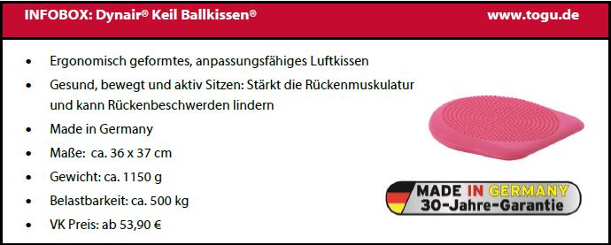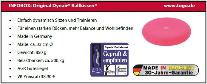 In der heutigen Gesellschaft ist Bewegungsmangel ein ernstzunehmendes Problem. Oft ist der stressige und bewegungsarme Alltag im Büro die Ursache. Viele Menschen klagen über Rückenschmerzen, Unwohlsein und eine geminderte Leistungsfähigkeit. TOGU® bietet dafür Lösungen. Das Konzept „Gesund Sitzen“ und die luftgefüllten, originalen Dynair® Ballkissen® ermöglichen ein aktiv-dynamisches Sitzen, das ganz einfach in den Alltag integriert werden kann. Ab 2018 gibt es die Sitzklassiker auch in pink. So kann FRAU mit minimalem Aufwand die eigene Gesundheit ganz einfach fördern.