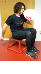 Isometrische Kniebeugeposition (mit Box Unterstützung). 4-5 Atemzyklen ausführen Hüfte, Becken,