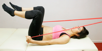 In Rückenlange mit den Beinen angewinkelt die zwei Enden eines befestigten Theragymbands anspannen