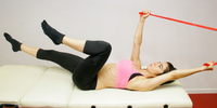 Rückenlage mit einem Theraband um den gesamten Rippenbogen gewickelt. Das Theraband wird vor