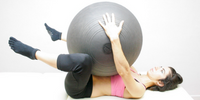 In Rückenlange mit den Beinen angewinkelt einen großen Gymnastikball zwischen den Händen und