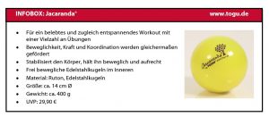 Der 400 g schwere Jacaranda® Ball hat einen Durchmesser von 14 cm und ist mit freibeweglichen Edelstahlkugeln im Inneren gefüllt. Durch das Training mit Jacaranda® werden die Kugeln in Schwingung gebracht, die sich auf den ganzen Körper übertragt. Somit wird die tiefliegende Muskulatur, vor allem im Bauch- und Rückenbereich, stabilisiert. Dank einer Vielzahl an Übungen ist ein belebtes und zugleich entspannendes Workout möglich, das Beweglichkeit, Kraft und Koordination gleichermaßen fördert.