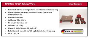 TOGU erweitert die Balanza®-Produktrange. Balanza® Vario besteht aus einer Holzplatte und hat austauschbare Füße. Er revolutioniert das Gleichgewichts- und Koordinationstraininga auf dynamische Unterlagen und ist mehr als ein einfaches Balance Board. Neben den klassischen, luftgefüllten Bällen, können auch kleinere Elemente an den vier Ecken angebracht werden. Zudem kann in der Mitte der Plate ein großer, luftgefüllter Ball befestigt werden. Das erhöhr die Trainingsvielfalt und bringt Abwechslung ins Workout. Gleichgewicht, Koordination, Kraft und Agilität werden mit Balanza® Vario gleichermaßern trainiert. Die durch die schwimmend, instabil gelagerte Standfläche entstehende Dynamik gleicht der Körper kontinuierlich aus. Somit werden die tiefliegenden Muskelgruppen aktiviert, welche maßgeblich für einen gesunden Rücken und die Stabilität des Körpers verantwortlich sind.