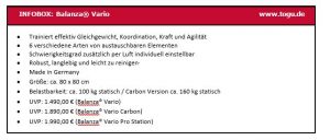 Balanza Vario – Made in Germany – ist die Zukunft des sensomotorischen Trainings für Rehazentren und Physiotherapie-Praxen. Die Therapie- und Trainingsstation aus Holz zeichnet sich durch ihre Vielseitigkeit aus: Ihre Stabilität wird anhand austauschbarer, luftgefüllter Füße sowie weiterer, kleinerer Elemente an der Unterseite variiert. Noch herausfordernder wird es mit einem großen, luftgefüllten Balls in der Mitte des Bretts – so muss das Gleichgewicht komplett austariert werden. Die verschiedenen Stabilitätsstufen sowie die Übungsmöglichkeiten erhöhen die Trainingsvielfalt und machen die Anwendung abwechslungsreicher als normale Gleichgewichts-Boards. Noch dazu fördert das Balanza® Vario Koordination, Kraft und Agilität. Physiologisch aktiviert die schwimmend, instabil gelagerte Standfläche die tiefliegenden Muskelgruppen, um die entstehenden Schwingungen kontinuierlich auszugleichen. Dadurch wird die Sensomotorik und die gesamte Rumpf- und speziell die tiefliegende Rückenmuskulatur gekräftigt, die maßgeblich für einen gesunden Rücken und die Stabilität des Körpers verantwortlich ist. Dank seiner Multifunktionalität eignet sich Balanza® Vario gleichermaßen für Patienten in der Rehabilitation wie für Hochleistungssportler. Das folgende Video gibt einen kurzen Einblick in das Training mit Balanza Vario www.youtube.com/watch?v=GquuBkRNOkA.