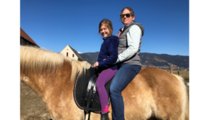 Abb.2: TherapeutIn sitzt dem Pferd im Kreuz und und drück Kind nicht in den Gurt.
