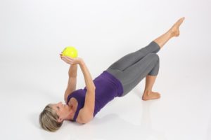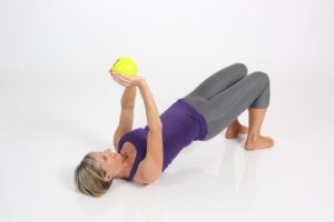 Bridge. Hold the jacaranda ball vertically above the breastbone and rotate in one direction for the next 10 seconds. Lift the upper body up to the points of the scapula maximally! Keep the pelvis stable!