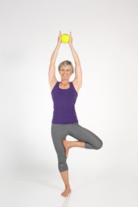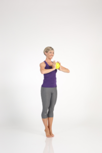 Closed toe stall. Hold the Jacaranda Ball with both hands at sternum level. Rotate the ball in one direction for 10 seconds, then in the other direction.