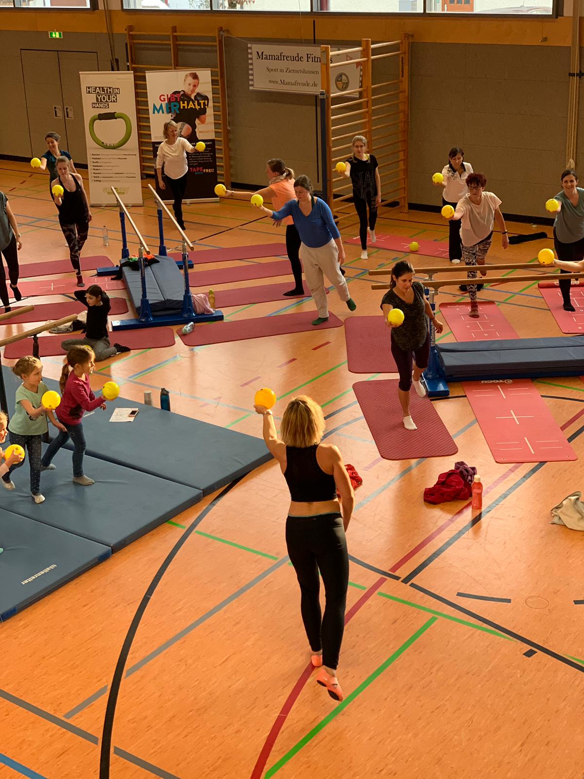Canan Nagl von Mamafreude Fitness präsentierte ihr neues MAMA BARRE WORKOUT. Das effektive Training an der Ballettstange ist beckenboden- und gelenkschonend und daher für Mamas optimal geeignet. Für den richtigen Halt am Boden sorgte die Gymnastikmatte JumpYone und für das Tiefenmuskulatur Training kam der Jacaranda Ball zum Einsatz.