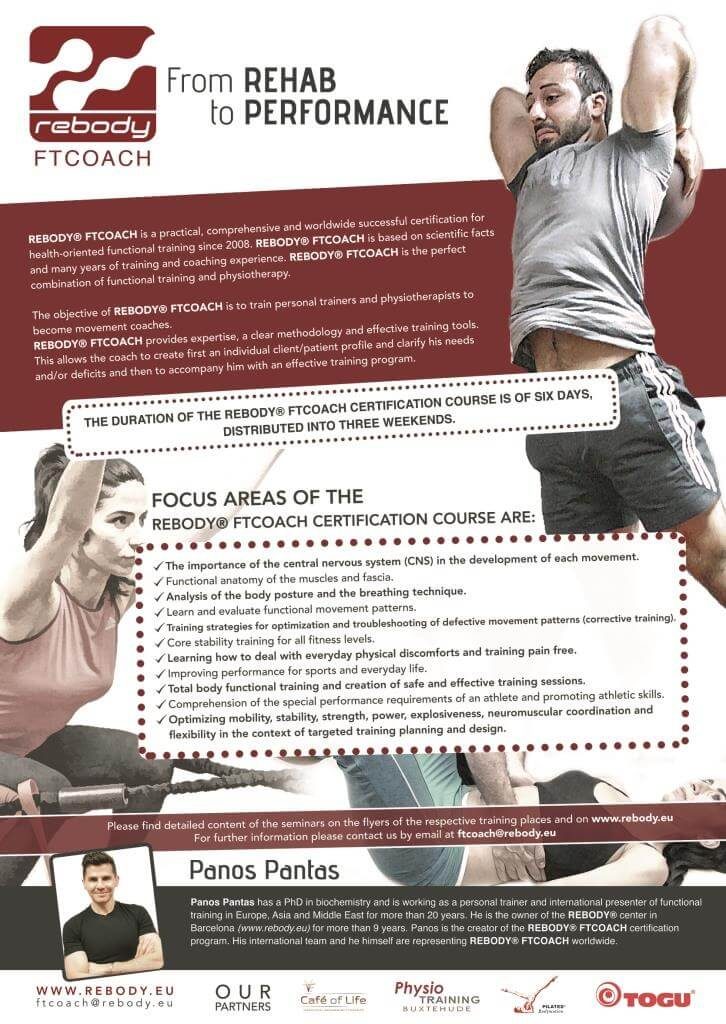 Rebody FTCOACH is the perfect combination of functional training and physiotherapy for optimal care of the customer-specific requirements and needs. The training is very structured and provides practical tools for assessment, corrective training, core performance, athletic development and recovery for clients of all ages & all fitness levels and accompanying clients in physiotherapy or after a rehabilitation as well as sports specific training for performance athletes.