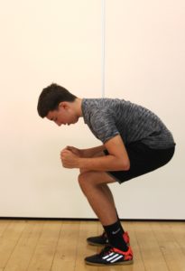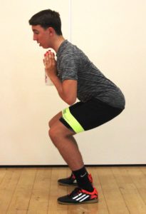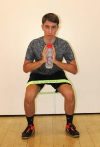 What happens now? By pressing your thighs against the resistance of the mini-band, your knees do not bend inwards and remain approximately above the ankle. Because the drinking bottle rests against the upper body in its entire length, the back remains largely straight. With these small aids you can help your participant to avoid the most serious mistakes in the squat. If you have more advanced participants who want to put more weight on your body, you can replace the water bottle with a dumbbell.