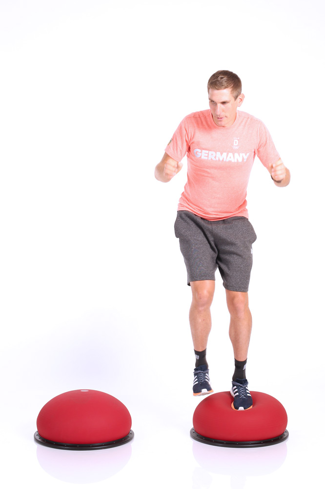The jumper, an air-filled trampoline ball, is used regularly in training for German biathletes – and also for cross-country skiers Andreas Katz. Michaela Kreitmair especially appreciates that the jumper is extremely practical for traveling: “I just need to take one device with me and can do so many exercises – in coordination training, dynamic leg-axis training or also hull training.” Exercises on the jumper can either with the stand or the ball upwards. The combination of strengthening, stabilization and coordination – standing, in supine or prone position or in the forearm support – makes training with the jumper varied and challenging. In addition to the large muscle groups, especially the deep muscles are activated and the inter- and intramuscular coordination is improved.