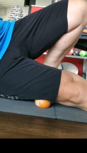 The largest muscle in the body is your gluteus maximus, or large pomus muscle. Hardening here can radiate upward into your lower back or down your leg to your knee. Find a hard surface and sit down. Now place the Actiball Relax under your buttocks and look for your trigger points. As always, stay on the trigger points and try to let the ball sink into the muscles.