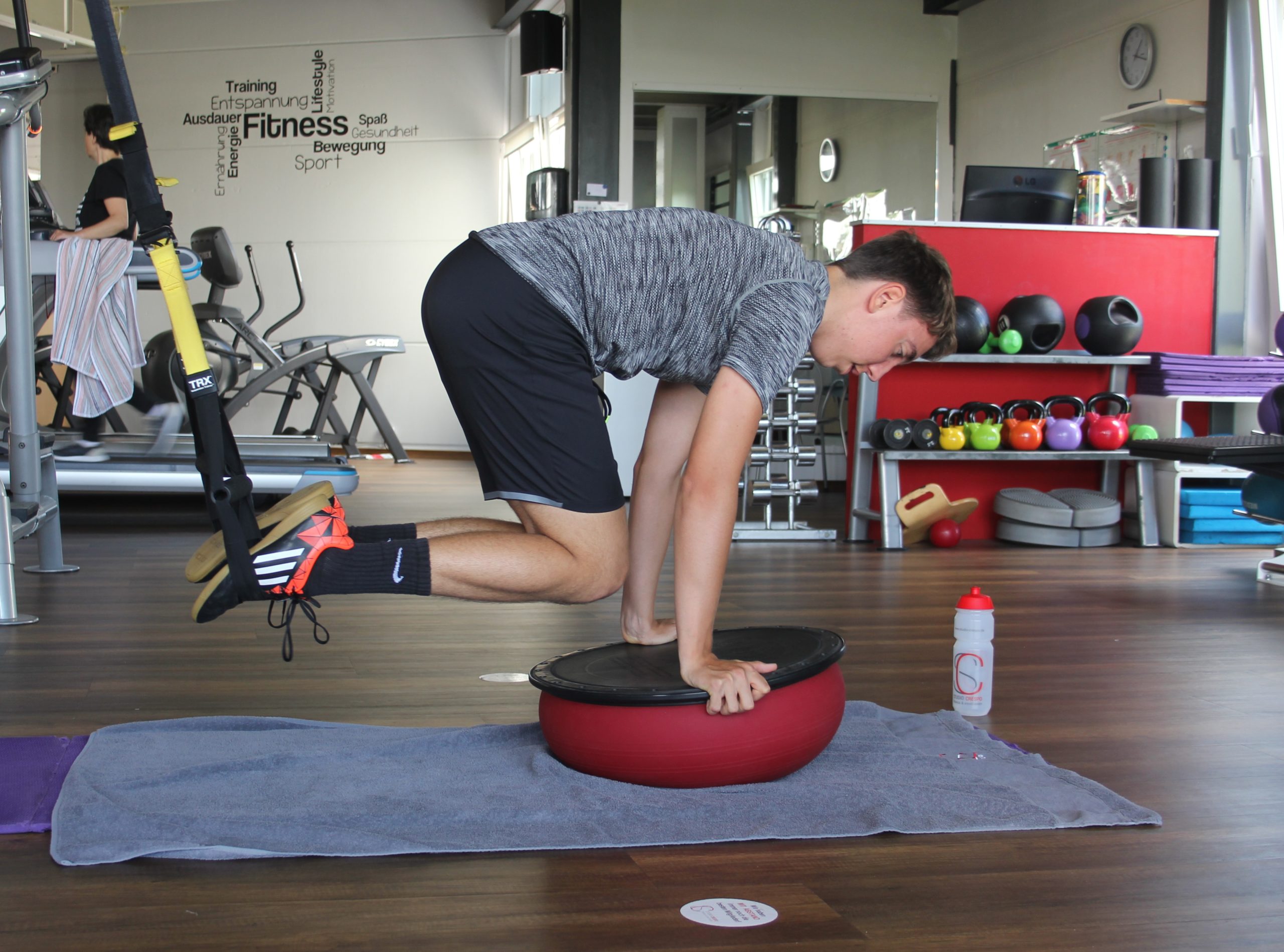 But if the “instability” is used correctly, the stability of the body benefits enormously. By using the instability – here the TOGU Jumper Pro®- in combination with other training devices like FlexVit Miniband®, Theragymband® and Slingtrainer the muscles are forced to compensate the movements of the TOGU Jumper. Depending on the exercise and the choice of training equipment, the instability strengthens the deep lying small muscles of the back, especially the multifidi muscle. The muscles around the knee and ankle joint are strained and therefore both joints are stabilized. The push-up exercise strengthens the entire shoulder girdle, and in combination with the mountaineering exercise, the abdominal muscles are also strained. It is important during the exercises to keep the jumper as horizontal as possible and to “tilt” it as little as possible.
