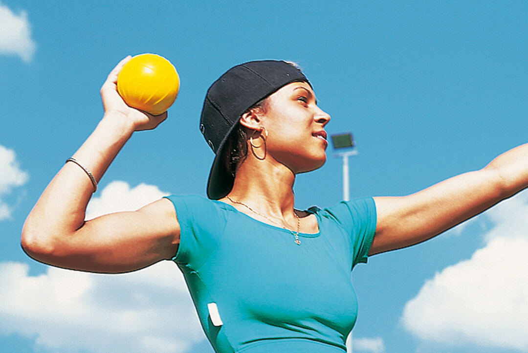 Zur Vorbereitung im Speerwurftraining. Durch die Fixierung der Noppe zwischen Zeige- und Mittelfinger liegt der Ball optimal in der Hand und die Haltung des Wurfspeers kann so ideal trainiert werden.